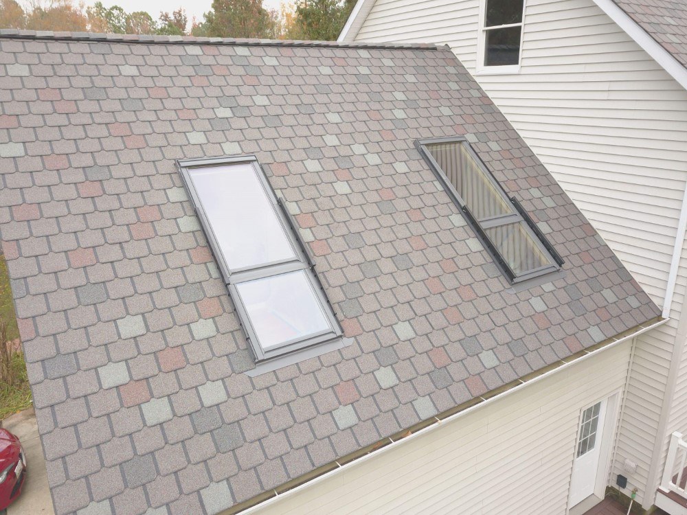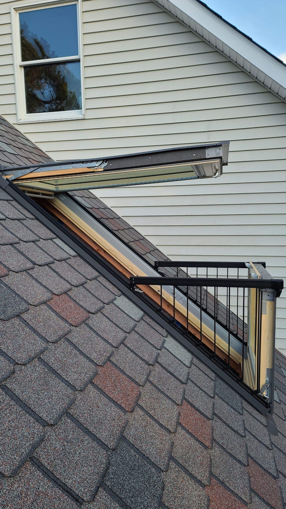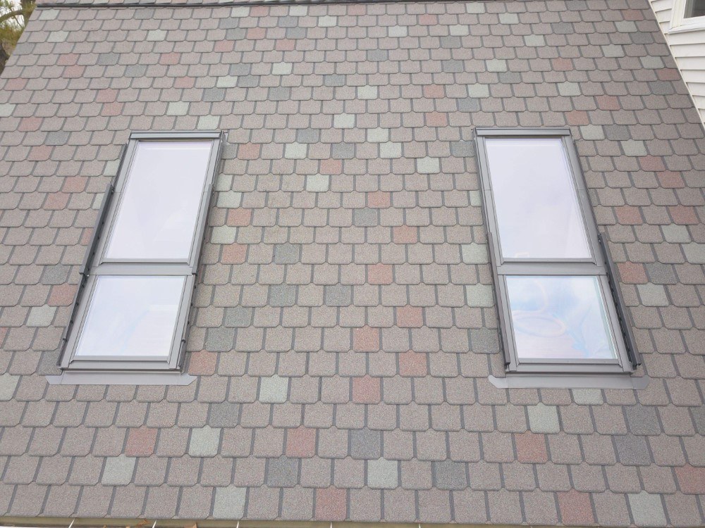 The wonderful owner of this home mad a great choice in choosing not only and amazing balcony roof window by Velux. But they also pick out one of the best designer asphalt shingles on the market today made by Owens Corning. The Owens Corning Berkshire is differently one of the nicest looking and toughest shingles made today. By adding the Velux roof windows to this room they have changed the feeling of this room for ever.